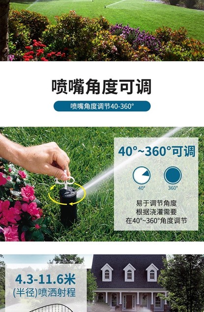 亨特PGP Ultra系列散射噴頭,提供1.5-6.1米射程,360°全圓或可調(diào)角度,適合小面積草坪灌溉。